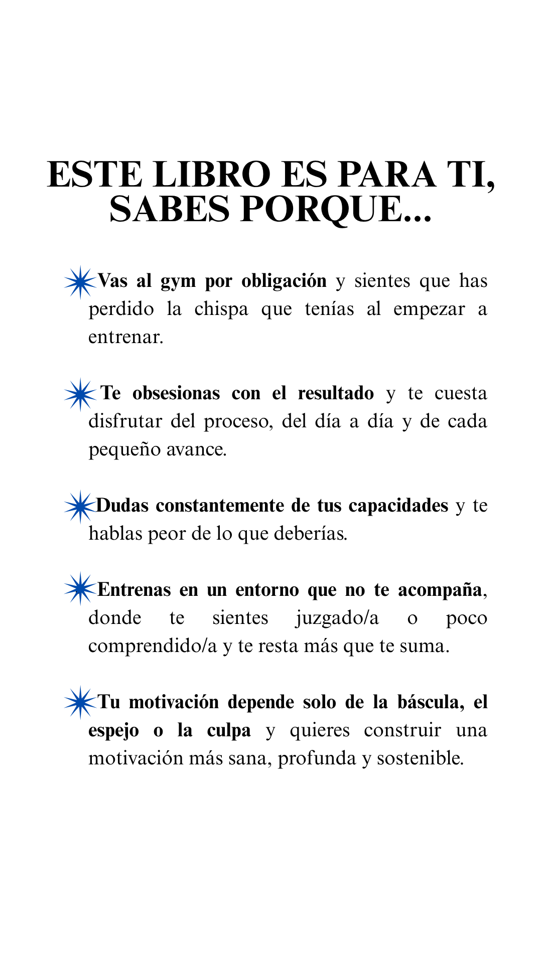 Este libro no viene a exigirte más, viene a acompañarte: a que dejes de pelearte con tu cuerpo, con tu mente y con el gym, y empieces a entrenar desde el cuidado y la motivación real.